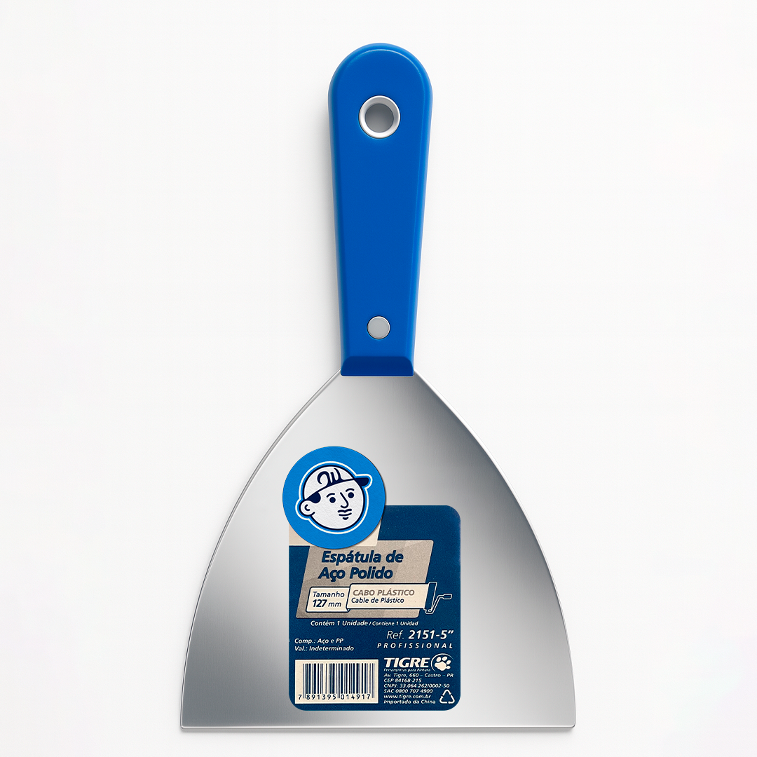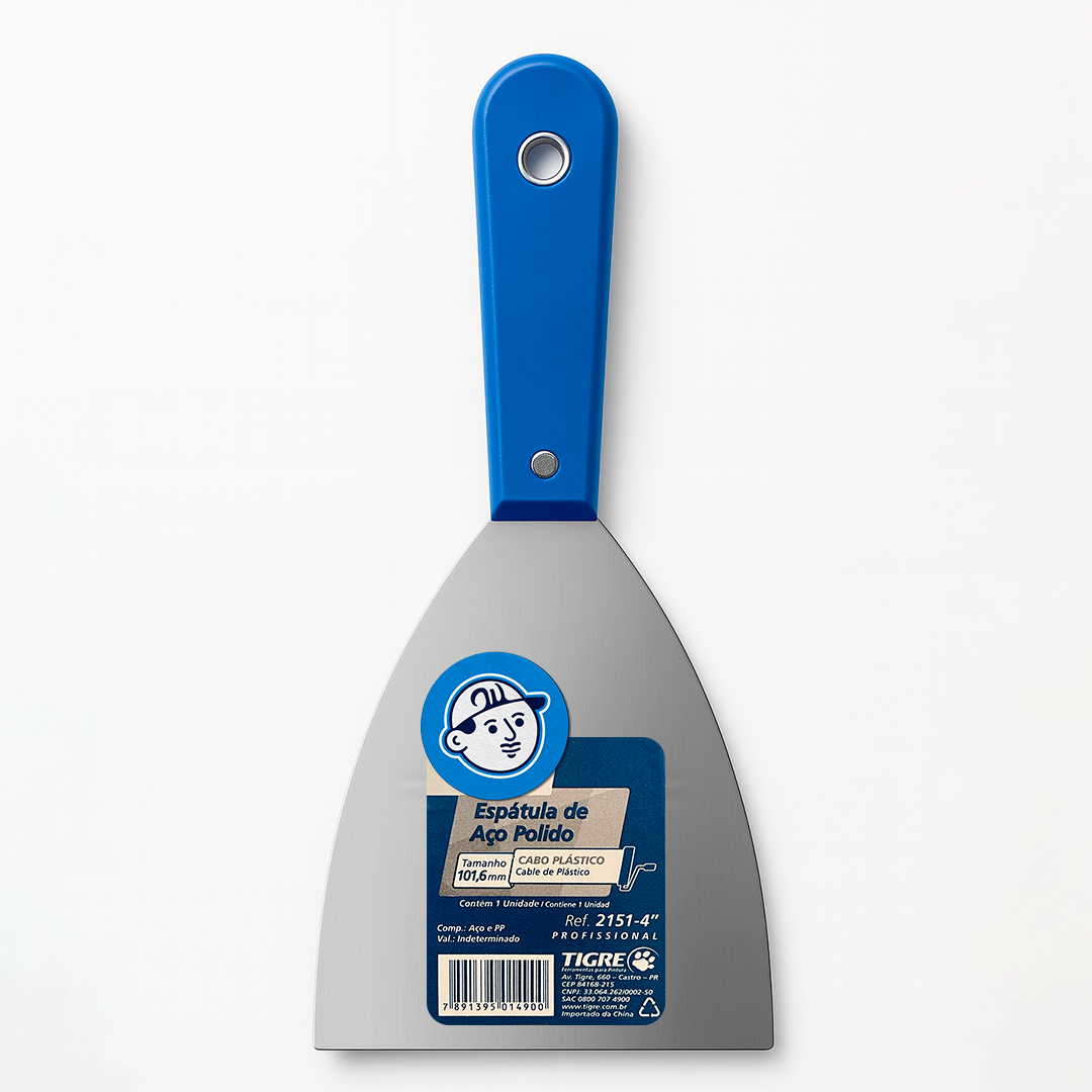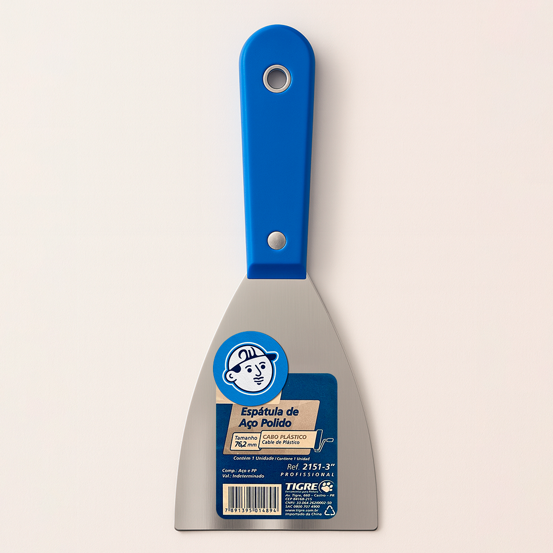 Title: Espátula Tigre Ref. 2151 – Aço Polido, Cabo Plástico (3″, 4″, 5″) Meta: Espátula de aço polido com cabo plástico ergonomico. Larguras 3, 4 e 5 polegadas. Ideal para massa, nivelamento e raspagem. Compre na Will.